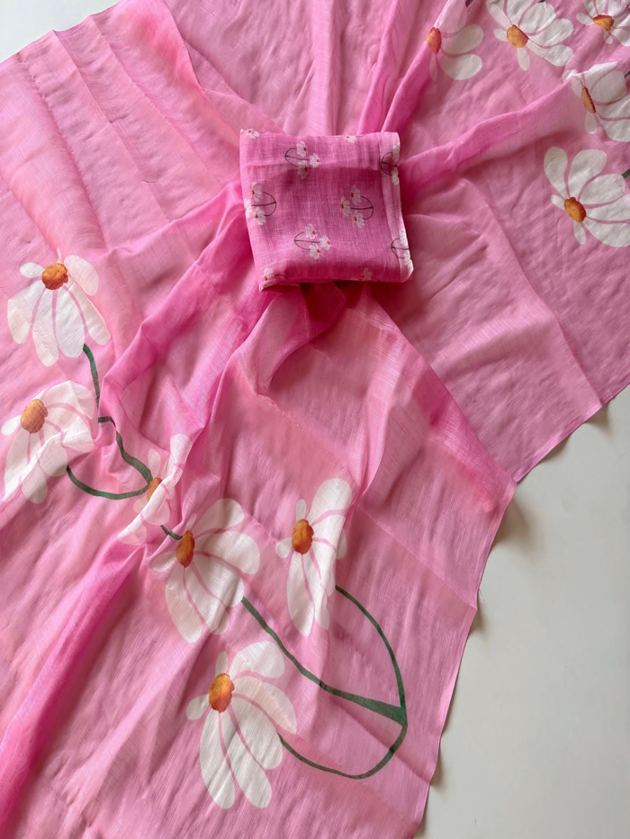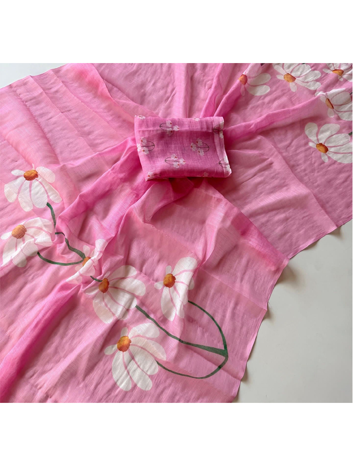 Flower Print Beautiful Elegant Indian Saree.This is a soft fabric. It is decorated with large white floral prints featuring bright orange centers and delicate green stems, adding a graceful charm The folded matching piece in the center complements the overall elegant and coordinated design.