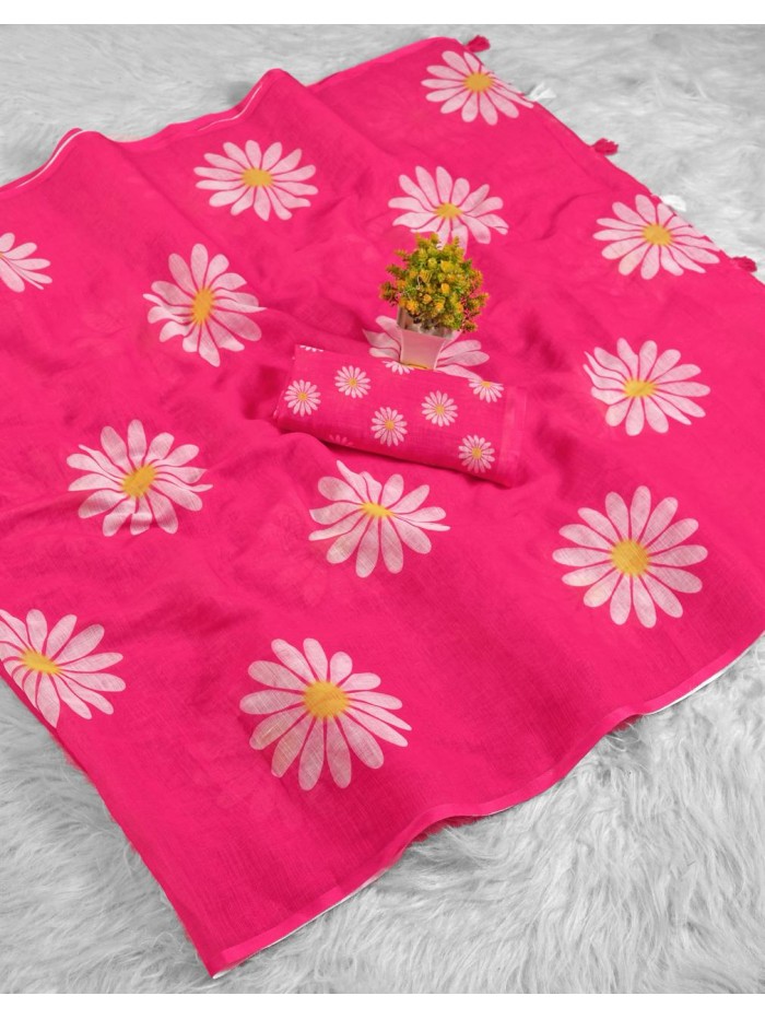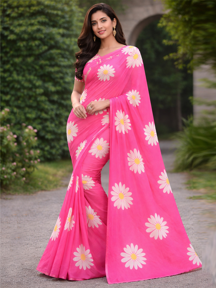 Make a bold style statement with this trending hot pink floral saree, adorned with elegant daisy prints for a vibrant and feminine look. Crafted from lightweight breathable fabric, it offers a smooth, flowy drape perfect for all-day comfort. Ideal for summer parties, festive occasions, and casual outings, this saree blends modern charm with ethnic elegance. A must-have stylish floral saree for every fashion-forward wardrobe