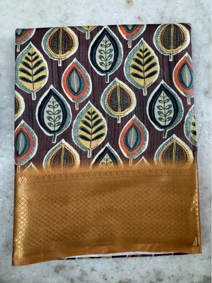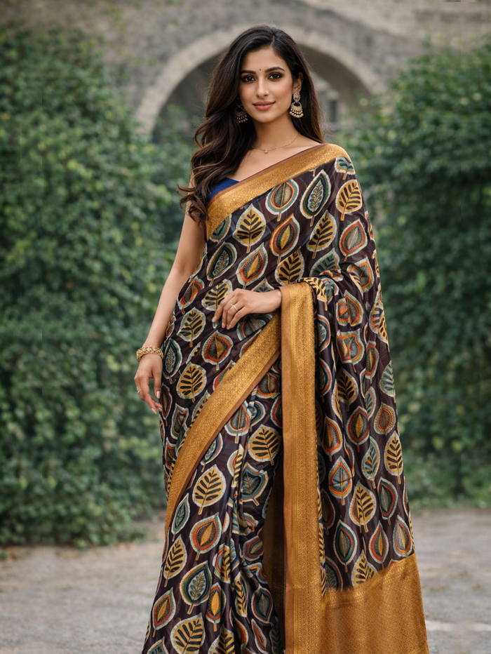 Upgrade your ethnic wardrobe with this beautifully crafted Dola Silk Saree, designed to give you a perfect blend of comfort and elegance. The saree features a rich deep brown base adorned with vibrant multicolor leaf prints, creating a stylish and modern ethnic look.