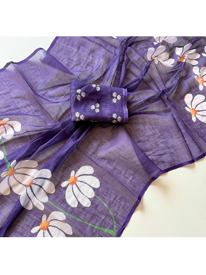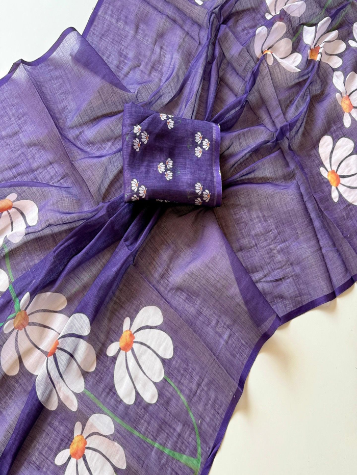 This is a lightweight, sheer purple fabric with a soft, flowy texture. It features large white floral prints with orange centers and green stems, giving it a fresh and elegant look. The matching folded piece in the center suggests it’s part of a coordinated outfit set.