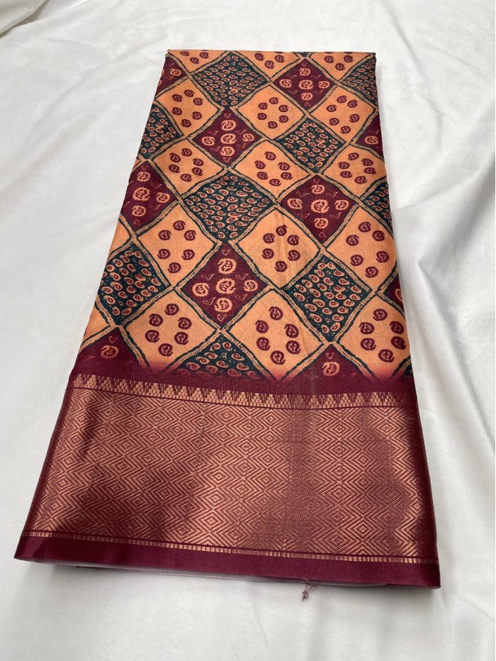 This saree has a very unique and stylish look with its beautiful printed pattern. The warm orange shade combined with traditional designs gives it a rich and elegant feel. The fabric is soft and comfortable, making it easy to wear and carry all day.The maroon border with a subtle golden touch adds a classy finish and makes the saree stand out even more.